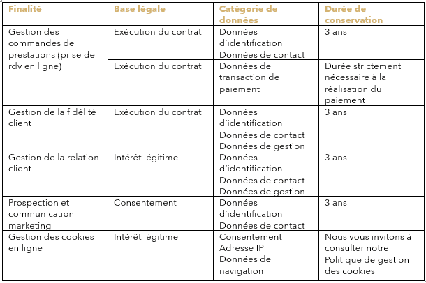 • Des données de gestion : historique photo de vos coupes, de vos prestations et commandes de produits, numéro client, information de contact, demandes d’information, futurs rendez-vous ;